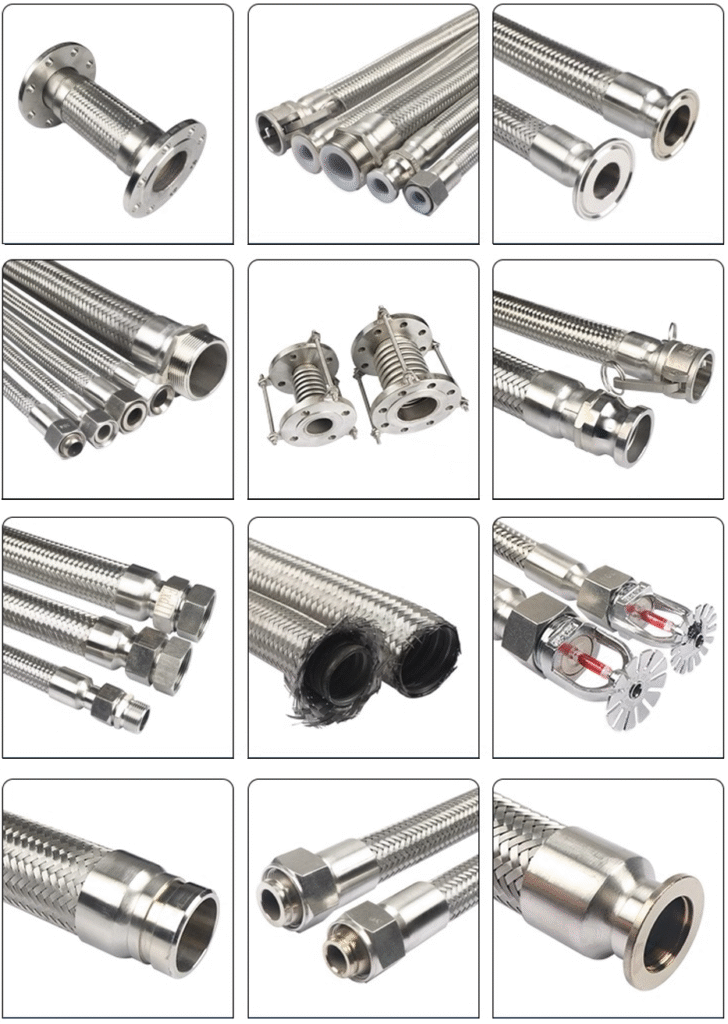 Stainless steel bellows consist of an inner corrugated tube, a metal braided mesh, clamps, and the chosen connection method. We usually classify them according to the type of connection, such as welded type, ferrule type, male-thread type, flange type, and quick-coupling type.